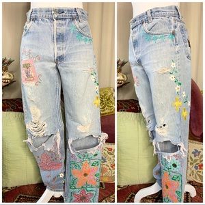80s vintage Levi’s 501 button fly jeans. Thrashed, frayed, full of holes, patched and painted. Embellished with painted florals, tiny mirrors, metallic cross shaped patches and one large pink label with elephant