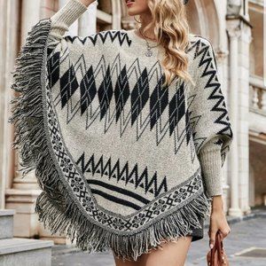 Love the print of the knit sweater poncho with fringe detailing. A must have the for season!! More colors