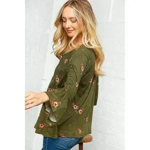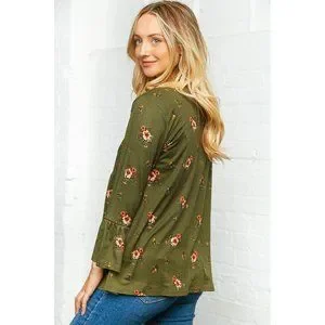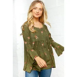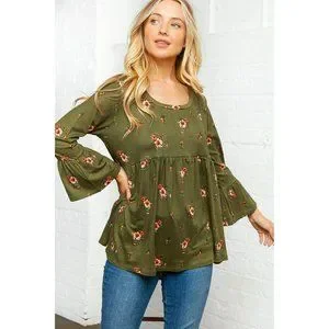 Olive Floral Bell Sleeve Babydoll Peplum Top