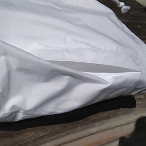 To his is new with tags never worn bought as a gift but never given away. It is white with the words champion going up the zippered Sleeve. The zipper goes all the way up the arm. 2 pockets on the front with drawstring. At the front. Jacket is fully lined.