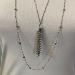 3 Tiered Silver Necklace. Gorgeous and feminine. Clear rhinestone. Silver tassels. Lobster claw clasp. Approx 2” extender. New boutique item.