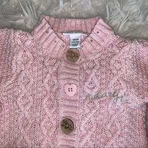 Sweet cable knit pink cardigan sweater by Naartjie. Mixed buttons down the front. Two little pockets on the front with bows. Excellent condition. Size 18-24 months. From smoke free home.