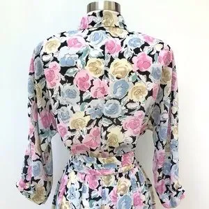 Vintage 1980’s Leslie Fay brand black with pastel watercolor roses floral print. Pink blue and yellow rose flowers. Pleats and collar belted dress. In gently used condition. Vintage size 14 fits like a modern size L