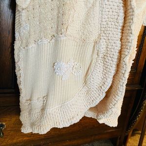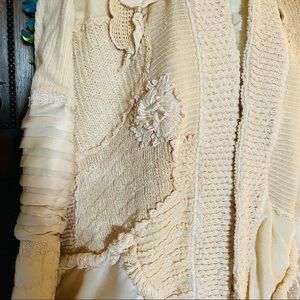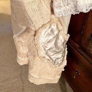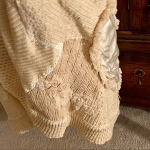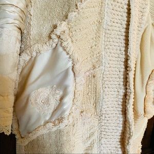 This gorgeous one-of-a-kind coat is made of random sizes patchwork ivory satin, ivory and light beige wide waled corduroy & various textured fabrics. Fully lined in brocade ivory satin. Seed pearl trim around neckline, hemline & down the front opening. Sleeves trimmed in lace. Appliqués with pearls and rhinestones applied over coat as shown. 100% viscose, trim poly rayon. Tag says hand wash, but I have washed on delicate cycle cold water.