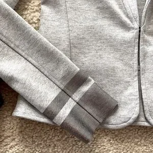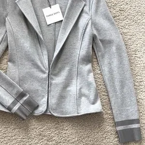 Three Dots Grey Blazer Jacket. Gorgeous wardrobe staple that can be worn with so many things! Grey coir with metallic grey/silver detailing around the wrists. One hook closure. Unlined. Laying flat approx 22” shoulder to hem, approx 16” pit to pit. 45 Supima 45 micro modal 10 spandex. Size S. NWT.