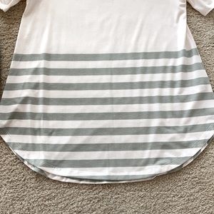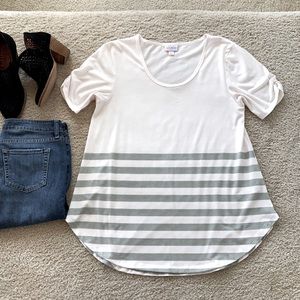 LulaRoe Short Sleeve Top. Super cute and comfy. Great with leggings or skinnies. Creamy white color with seafoam green stripes. Sleeves have rusching detail. Scooped neckline. Laying flat approx 28.5” shoulder to hem, approx 18” pit to pit. 95 polyester 5 spandex. Size XS. Excellent condition.