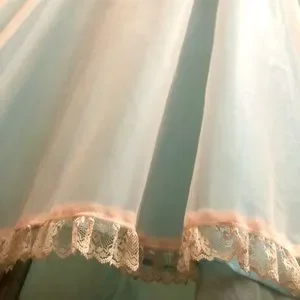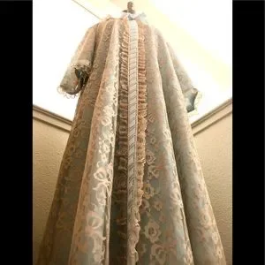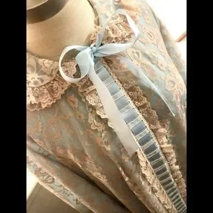 Odette Barsa lace peignoir (or dressing gown). It typically features a delicate lace overlay over a blue or cream lining, and was made in the 1950s or 1960s.
