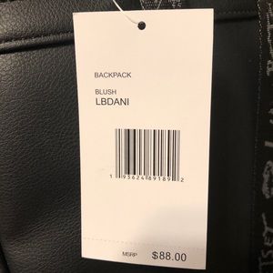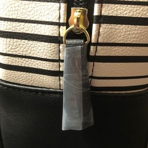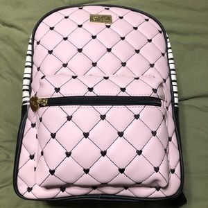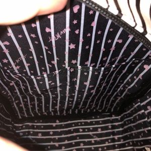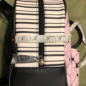 *Front of bag is blush pink with embroidered black hearts, sides are black and white striped, back is solid black