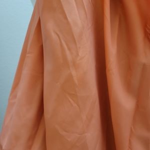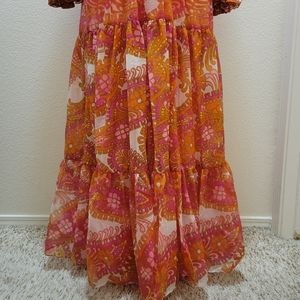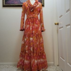 Beautiful long Floral dress. Sheer dress with inside orange lining. Back zipper. Ruffle neck, collar and cuffs. Matching belt with snap on buttons. Wear with belt or not. Dress is layered