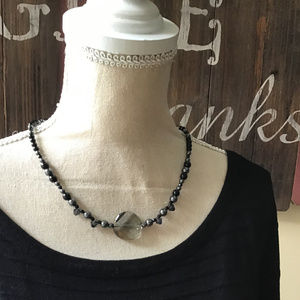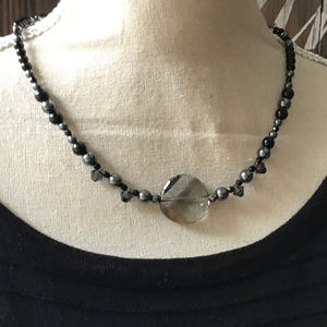 A 3/4" diameter faceted Smoke Swarovski Crystal centers this 16 1/2" necklace and is complemented with top drilled smoke Swarovski's to catch another dimension of light along with Hematite, jet black Swarovski Crystals & genuine Black Onyx gemstones. Finished with a large 1" x 1 2/4" Hematite toggle clasp to catch some attention at the nape of the neck. Elegant and fun!