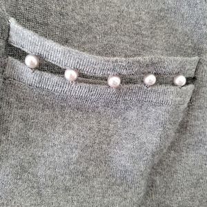 Medium Gray open front cardigan sweater. Trendy pearl trim pockets. Modern Feel. Long sleeves. Ribbed hem and cuffs.