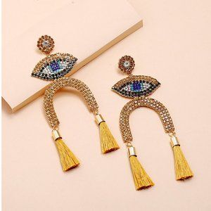 Big Rhinestone Gold and Blue Eye Tassel Drop Earrings