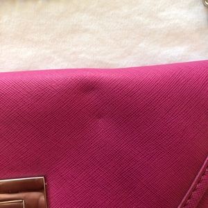 Fun bright pink color with silver hardware. Removable chain that is long enough to wear crossbody style. Has inside small zipper compartment. Used once. Has a few front and back indentations (pictured) from storage but otherwise in good condition with no stains or tears.