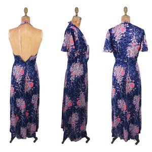 Vintage 1970s Halter Maxi Dress and Capelet Set Dark Floral Print | W 24"