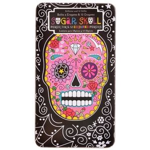 Brand New, Never Used, In Box! Celebrate your inner artist with the help of this festive Sugar Skull Colored Pencil Set, featuring a rainbow of pencils embellished with black and white sugar skull designs. This set comes in a beautiful black tin decorated with a vibrant pink sugar skull - so even after you've doodled the colored pencils away, you'll still have an awesome reusable storage tin for keeps!