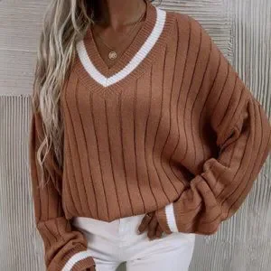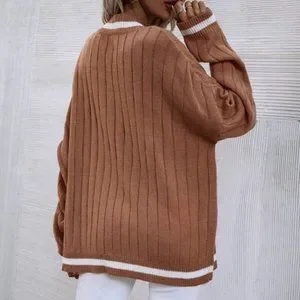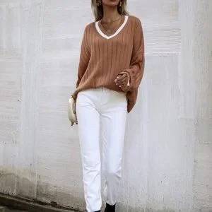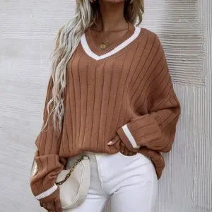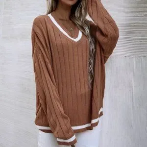 Chic and Classy Contrast Trim Drop Shoulder Sweater - tan