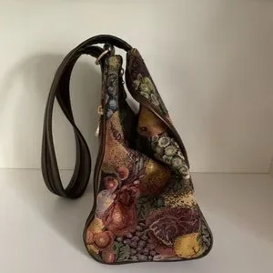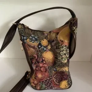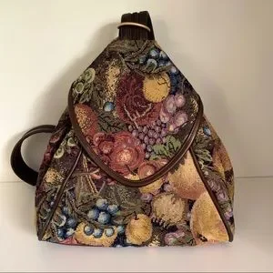 Vintage brocade purse. Strap unzips to Converts into backpack. Many compartments. 9”x5.5”x9.5”. Brushed gold hardware.