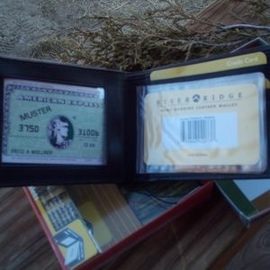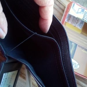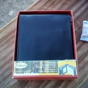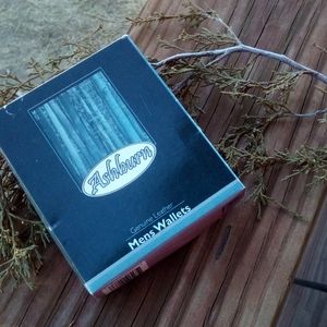 Black Ashburn Wallet. A double fold that has inserts, a couple of pockets in the back. It even has a zipper pocket on the back for your big bills or whatever. Box has a little fading on it, but it is clean and good even for a present. Bundle for deals.