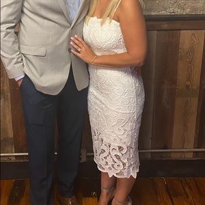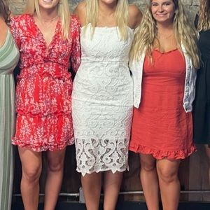 Like new Bardot Lina Lace Sheath dress in white. Only worn once, for a few hours in summer of 2021. Looks brand new. Has adjustable straps. Size small, fits true to size.