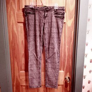Gray Diamond Geometric Pattern Gothic Moto Metal Bandwear Jeans with zipper details and 2 back pockets by Rue 21. Tag size is 5/6, but they fit more like an 8. Dimensions are 17inches wide, 8 inches rise, 29 inches inseam.
