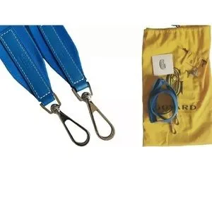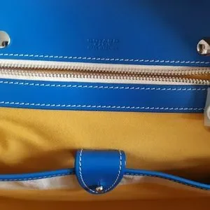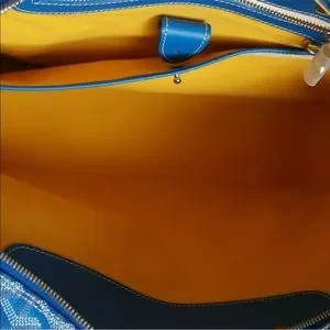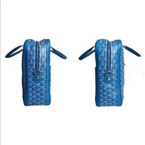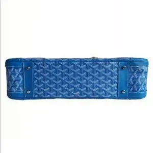 Crafted of Goyard signature chevron monogram canvas in blue, the bag features two rolled leather handles with silver buckles, top zipper closure with silver logo pulls. One exterior front pocket. Leather trim and corners with a detachable canvas shoulder strap. Interior lined with yellow fabric, one zipper pocket and one compartment. Comes with dust bag, keys and lock, and three protective rubber tubes.