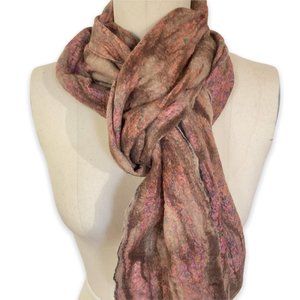 Artisan made nuno felted scarf by Pomegranate Moon, new with tags. It's a lovely brown and tan merino wool over an upcycled, gauzy pink silk with a delicate floral motif.