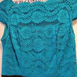 Worn once. Beautiful dress on. Flattering figure. Full lace dress with black belt feature (built into dress)