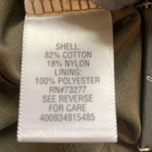 Shell: 82% Cotton, 18% Nylon. Lining: 100% Cotton. Made in China