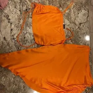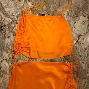 Amanda Uprichard orange silk skirt and crop top set. Tank is XS, Skirt is S