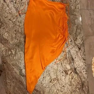This is a beautiful, orange silk Amanda Uprichard skirt and top set. It was worn once, and dry cleaned. It’s beautiful, a real statement piece.