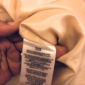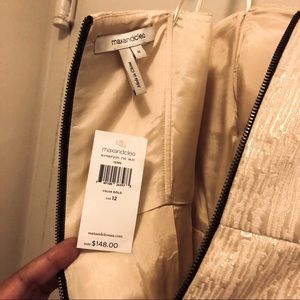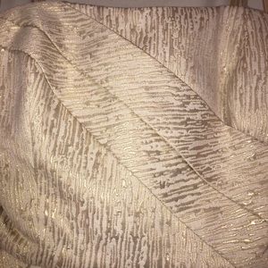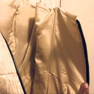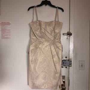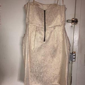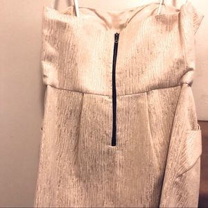 Lined textured gold knee length cocktail dress. Pleated Strapless top with boning for support and front pockets. Wonderful for special occasions weddings, Christmas and New Year’s Eve party, etc. Size 12, may be hand wash but dry clean is recommended. Measurements are 19 inches pit to pit and 31 1/2 inches in length.