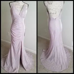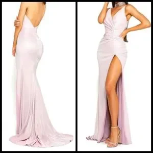 NWT! Gorgeous sparkly designer bodycon mermaid formal dress by Portia & Scarlett. Hugs cruves & accentuates figure. V neck w/ long flowing train. Pink. Tag sz 8. Sexy thigh slit Front ruching w/ glitter