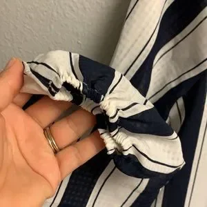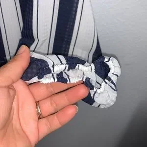 Navy Blue Striped Blouse Sz S. Gently used. No tears or stains. Clasp works fine in the back. Elastic in the wrist are in perfect condition. Maybe used one time. T700