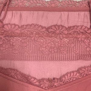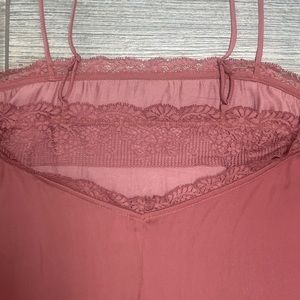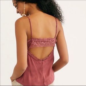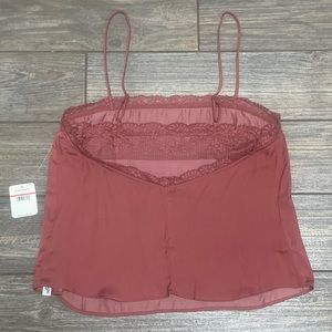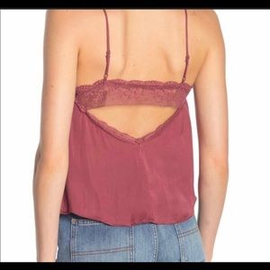 Silky lace trimmed cami featured in a flowy, slightly cropped silhouette with an open back.