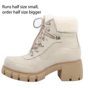 Stylish shearling ankle boot featuring round toe, shearling trim, round toe, faux suede, and a lug platform block heel. Platform 1" to 2 1/2" heel. Model is a size 7, and a size 7.5 fits her perfectly. Runs slightly snug, best to order half size bigger.