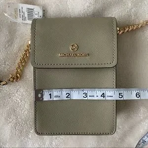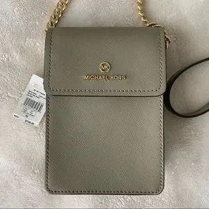 NWT Michael Kors Jet Set Charm in Dusty Sage green. I bought this small crossbody thinking it would replace my larger purse, but I was wrong 😑 I still think I need to bring more than I need.