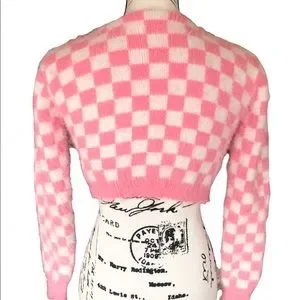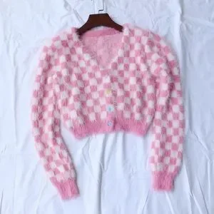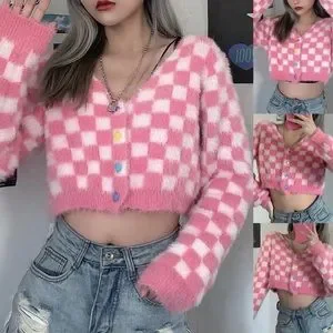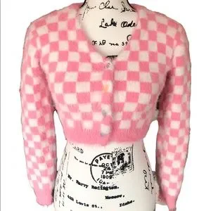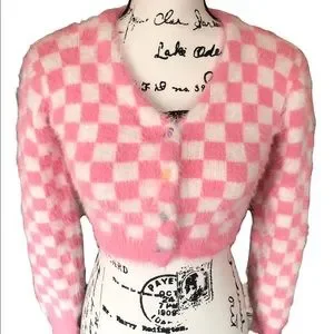 Plaid sweater pink white womens cardigan long heart buttons