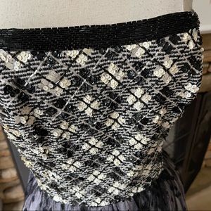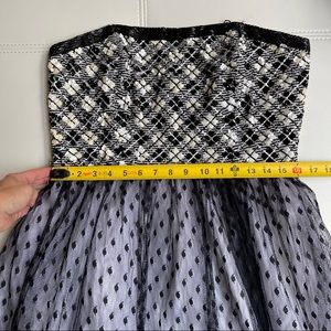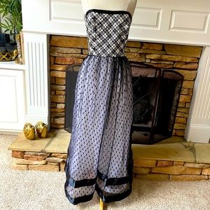 Vintage Bill Blass Evening dress size 14 or large (see photos for measurements of chest waist and length. Sequined gingham black white plaid upper and polka dot tulle layered skirt with boned petticoat skirt. Some under layers have damage, but not noticeable when wearing. Stunning dress!! I believe it originally had straps and they could easily be added.