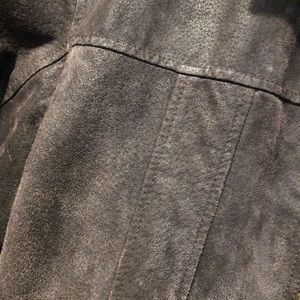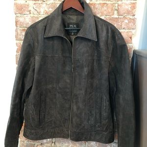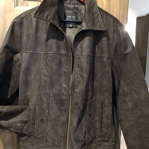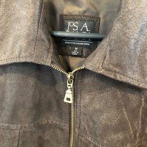This is a NWOT , leather weathered jacket designed by JoS A BANK executive collection ,, deep dark brown leather , bronzed zipper up front , lots of detailed seams , nice large collar , snaps at wrist ,banded design at bottom !