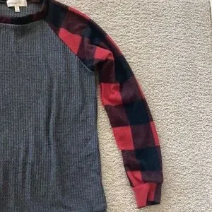 Black, Red, Grey Long Sleeve Tunic Top. Fabulous and super soft! Black and red plaid sleeves with solid grey waffle feel body. Long sleeves. 60 polyester 35 rayon 5 spandex. I am modeling size Small. Relaxed fit is true to size. New boutique item.
