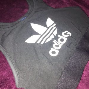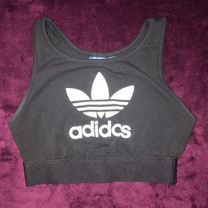 Black Adidas sports bra with white logo across front. In excellent condition.