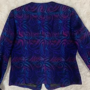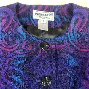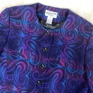 Gorgeous vintage Pendleton blazer or suit jacket. 100 percent virgin wool. Made in USA 🇺🇸. Beautiful colors of blue, purple and dark pink paisley print. Shoulder pads.