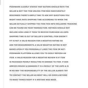 -I PLACE MUCH IMPORTANCE ON BUYERS WHO HAVE PREVIOUSLY PURCHASED FROM ANY BUYER ON POSHMARK AND FOLLOWED PROPER PROTOCOL-ACCEPTED PURCHASE IN A TIMELY MANNER, LEFT A STAR RATING & A LEFT AN OPTIONAL KIND COMMENT.REVIEW MY NUMEROUS FEEDBACK RECEIVED FROM MY VALUED CUSTOMERS