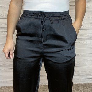 Beautiful satin joggers with drawstring elastic waistband, pockets, and faux slit back pockets.