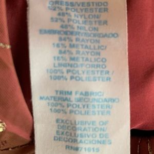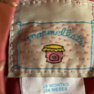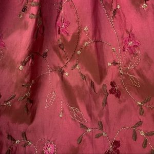 This is a beautiful cap sleeve Party Dress from Marmellata, girl’s size 24 months. The taffeta fabric, 52% polyester/48% nylon, is a unique Rose pink that has a brown tone with shifts in lighting. Features back button closure, attached sash, full lining and attached tulle petticoat, and exquisite floral embroidery in metallic gold, bronze, and pink threads. Your little one will feel like a Princess in this dress!