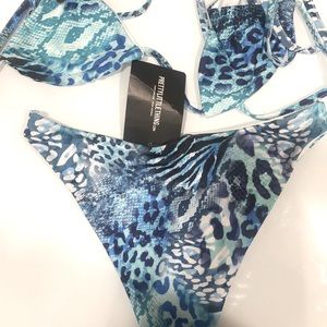 Blue leopard print two piece bikini from PLT. Brand new with tags and both pieces included. Bottoms are high rise and size US 8 and UK 12. Top is US 8 as well.