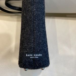 Adorable vintage 90s black/charcoal wool handbag by Kate Spade. Black leather handles with a whistle running stitch. Black leather bow with a the white running stitch on the front. The top has a magnetic snap. Bottom has 4 silver studs to keep it off the ground. Made in America.