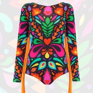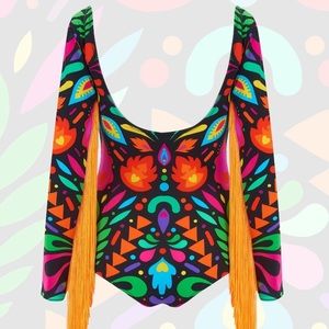 Adorable Rainbow/Multicolor Black Fringe Sleeve Rave Bodysuit by LOM.