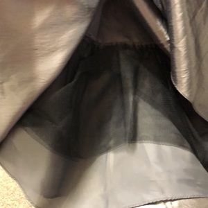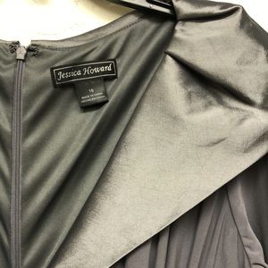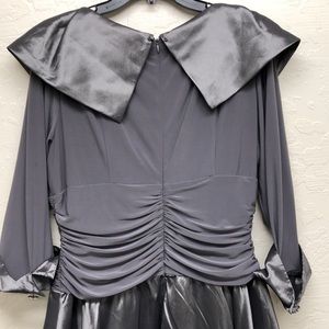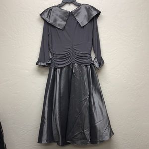 This dress is gorgeous. Gathered V collared neck line. Ruched waistline. Zip back. 3/4 sleeve. Netting on bottom of skirt inside. Bodice and waist are stretchy.