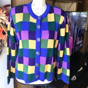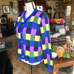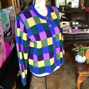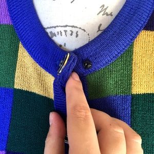 Women’s super cool vintage Ani Knits checkered button up sweater. This sweater is in excellent condition no stains holes or rips no missing buttons. The material is 85% acrylic 15% nylon the size is a women’s plus size 14 the measurements are total length 22” pit to pit 22” sleeves 23”. This sweater has shoulder pads made in but can be removed if desired super fun and unique colors in this checkered pattern design with bright blue buttons going all the way down can be worn buttoned up or open. This sweater is a short cut style at the bottom and slightly in the sleeves. I love this sweater I think is so much fun and retro style and is so versatile and easy to style.💕😊